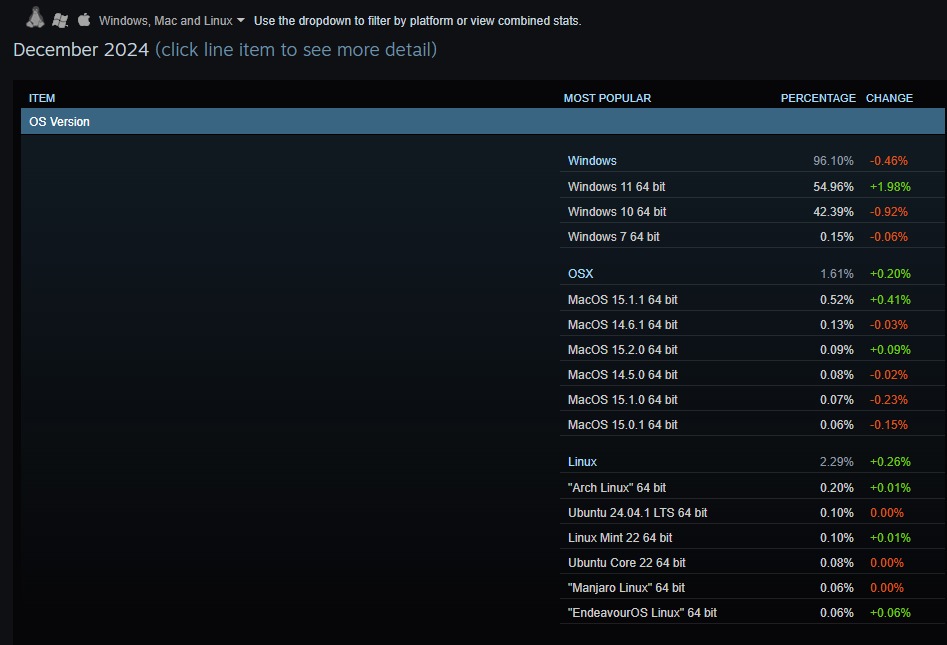 A 2025-ös évet erősen nyitja a Windows 11. Míg korábban elég közel táncolt egymással a Windows 11 és 10, januárra már brutális különbség alakult ki a két rendszer hozott. A Windows 11 közel 55%-os szeletet kér magának a játékosok körében, a Windows 10 pedig szépen lassan 43% alá ért. Biztosak lehetünk abban, hogy ez a tendencia tovább folytatódik majd az év többi hónapjában is, hiszen a Windows 10 támogatása ősszel hivatalosan is véget érhet. Addig pedig sokan kénytelenek lesznek fejleszteni a masinákon, hogy a TPM, SecureBoot vagy éppen DirectX 12 követelményeknek is megfeleljenek.