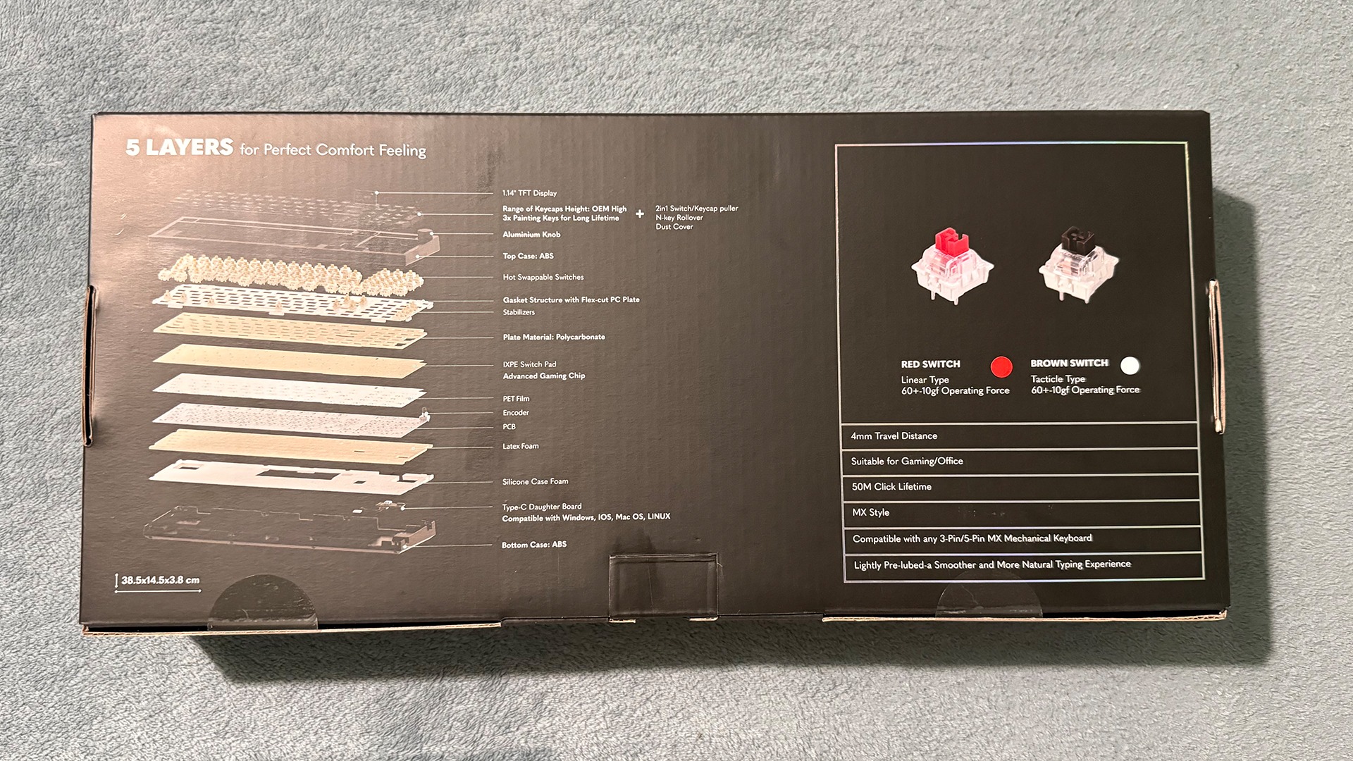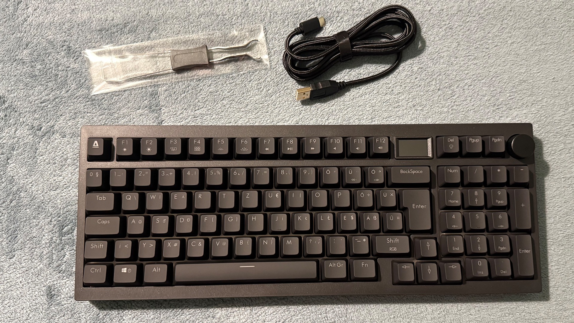 A GM03 tehát egy 98%-os billentyűzet. Ennek köszönhetően szinte minden billentyűt megtalálunk a periférián, ám kicsit kompaktabb formában, mint a teljes, 100%-os kiosztás esetében. Ez remek választás lehet azoknak, akik nem tudnak lemondani a numpadról, ám spórolnának pár centi helyet az asztalon. Első ránézésre két adalék is feltűnhet. A billentyűzet jobb felső sarkában egy knobot, azaz fizikai tekerőgombot találhatunk, míg az F12 és Del billentyűk között egy TFT kijelző tetszeleg. Ezekkel később részletesen is megismerkedhetünk, hiszen szorosan kapcsolódnak egymáshoz.