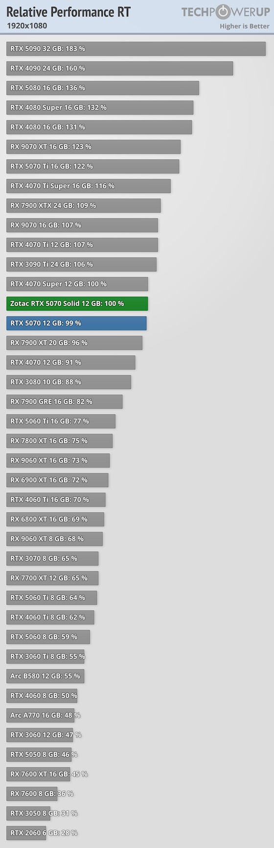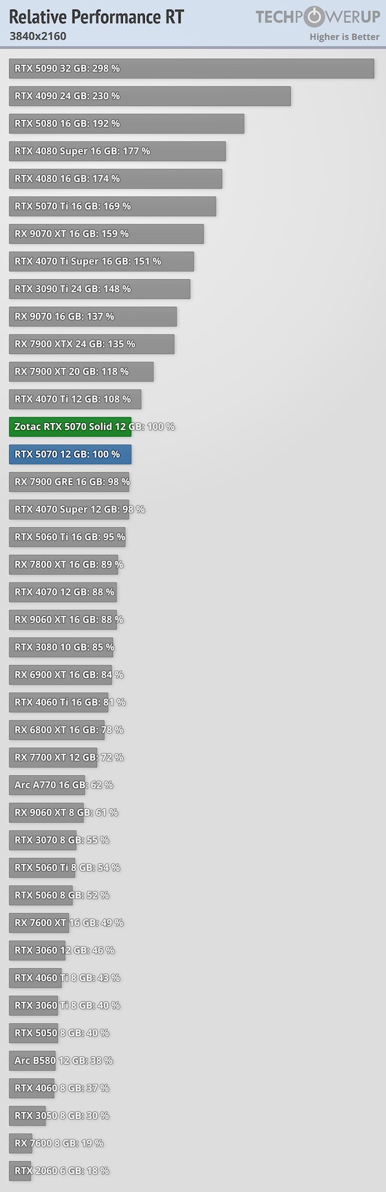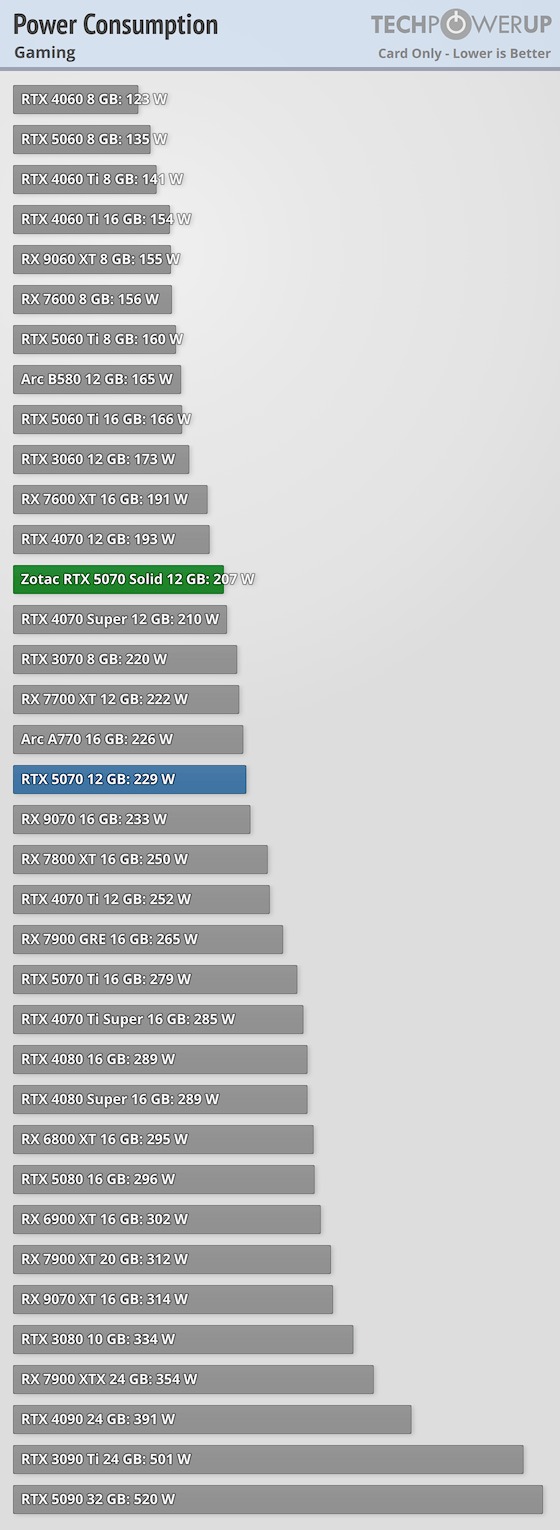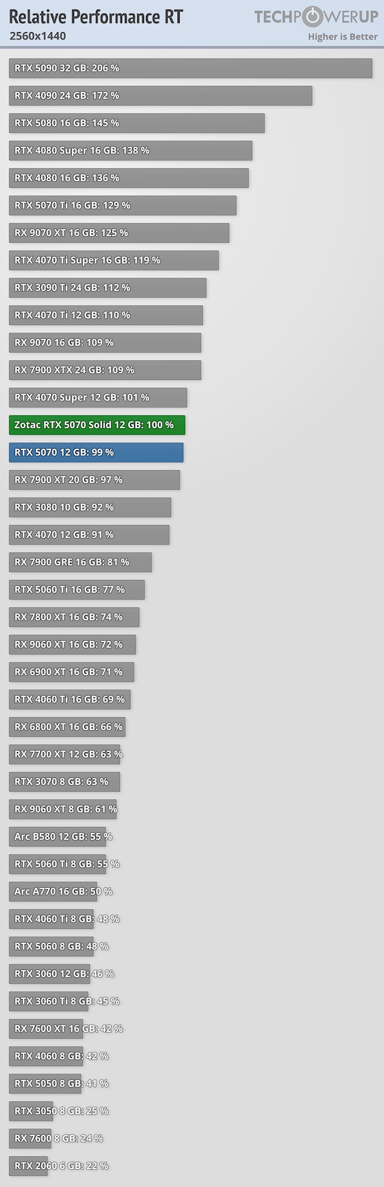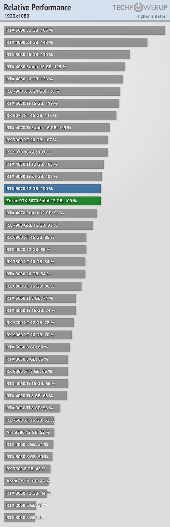 A fenti táblázatok a legfrissebb, Zotac GeForce RTX 5070 Solid TechPowerUP tesztből származnak.