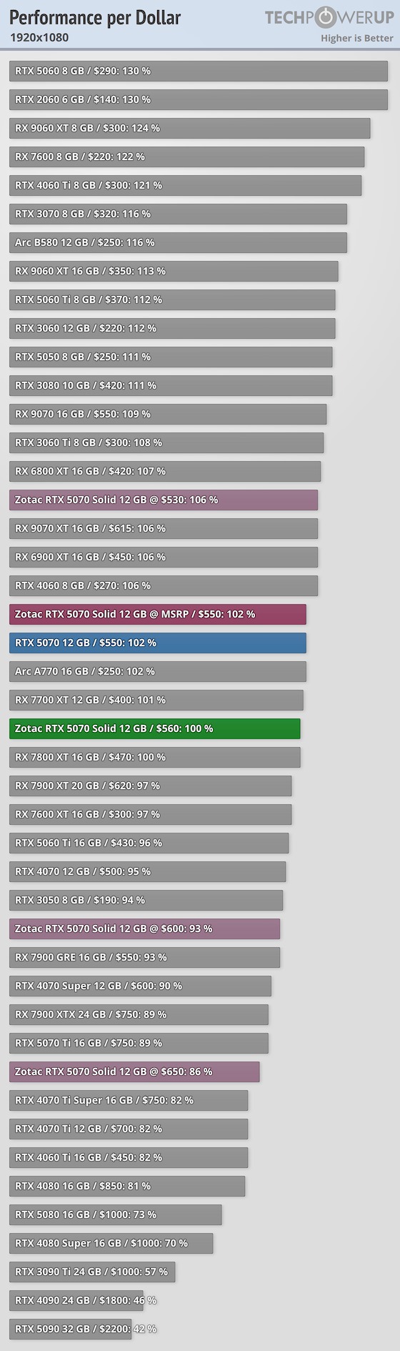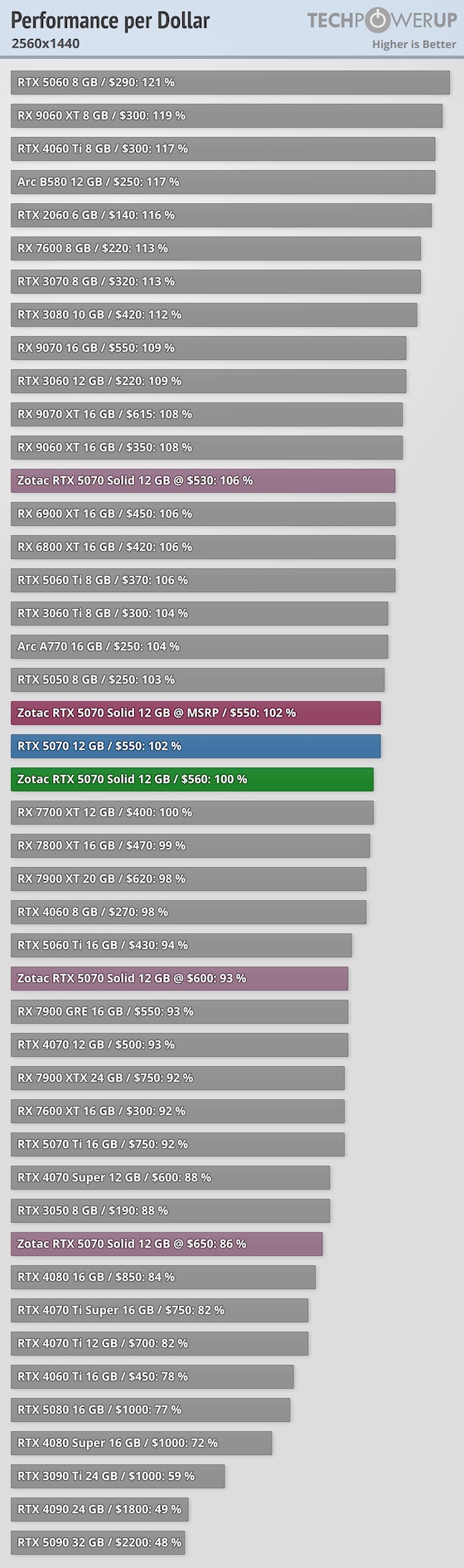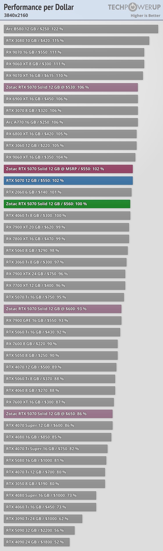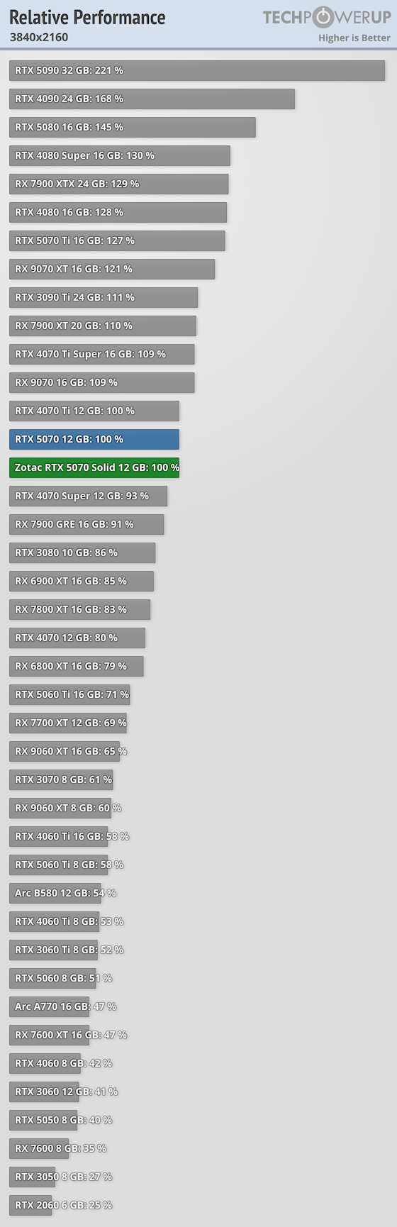A fenti táblázatok a legfrissebb, Zotac GeForce RTX 5070 Solid TechPowerUP tesztből származnak.