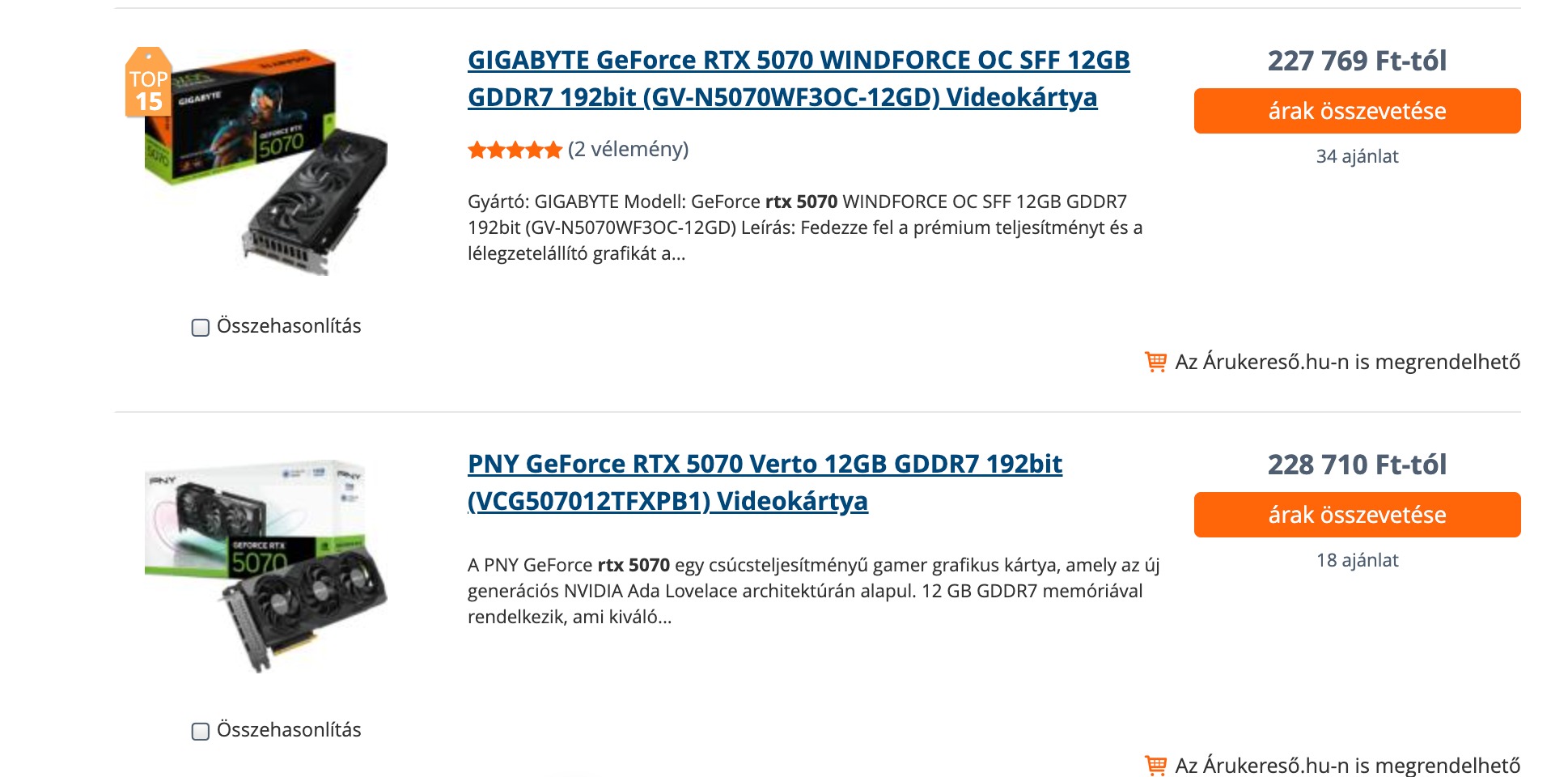Jelenleg a legolcsóbb RTX 5070-es kártyákat 225-230 ezer forint környékén találhatjuk meg. Az első időszakban volt ez még 250-270 ezer forint is, ám azóta szerencsére már jócskán mérséklődtek az árcédulák. 2025 novemberének hónap azonban ismét rámosolygott a játékosokra a szerencse, hiszen a jelek alapján már a lélektani határhoz közel, 200 ezer forint környékén is vadászhat magának az ember Nvidia RTX 5070-es kártyát.