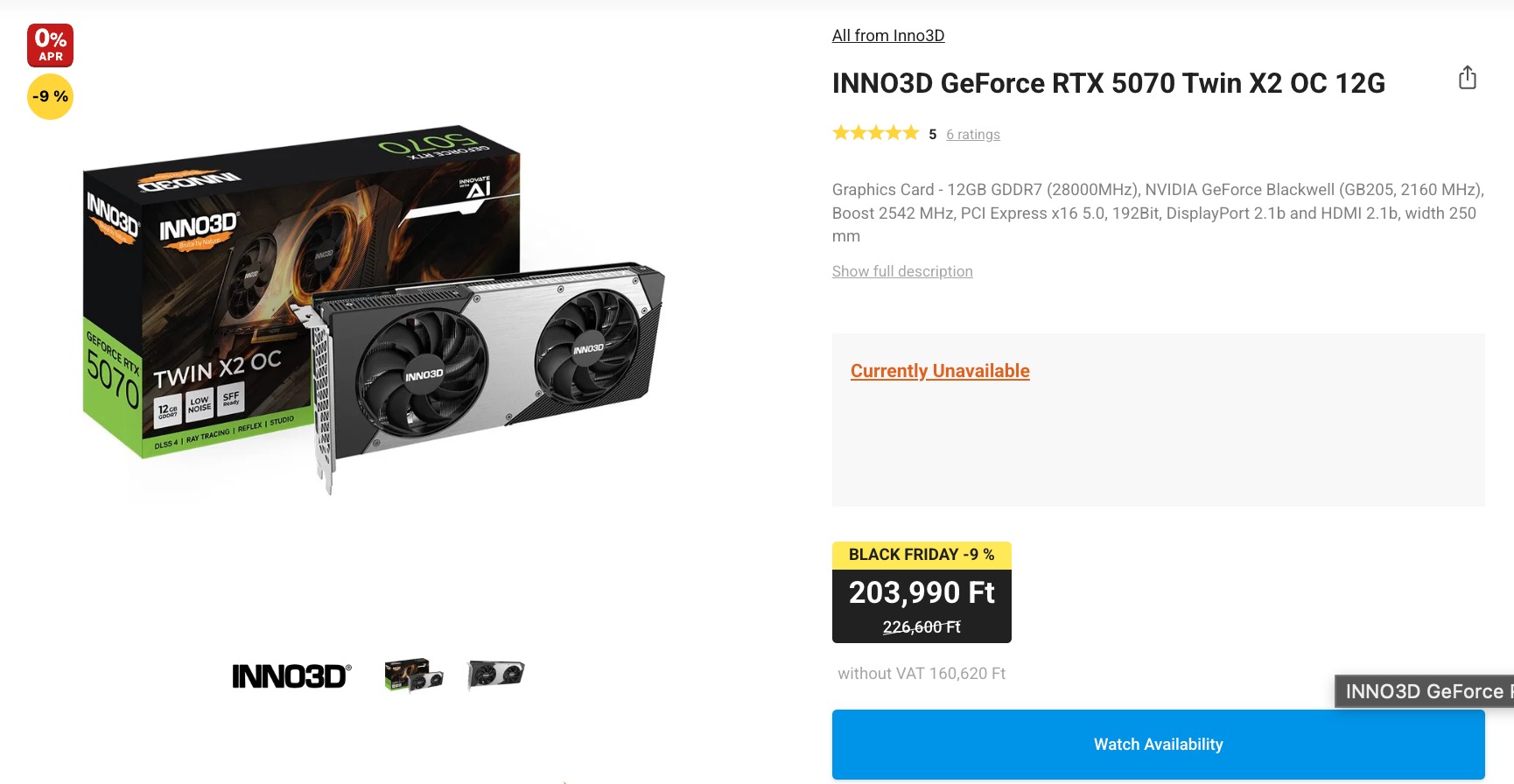 Az Alza Black Friday akciójának egyik sztárja a fenti képen látható INNO3D GeForce RTX 5070 Twin X2 OC 12G. Az oldalon gyakorlatilag naponta kiürülnek az éppen raktáron lévő kártyák, ám viszonylag nagy gyakorisággal töltik vissza a készleteket az oldal munkatársai. 204 ezer forintos árcédulájával már-már az RTX 5060 Ti árkategóriába érkezik meg a kártya, így érdemes lehet résen lenni, mikor kerül fel újra az oldal felületére.