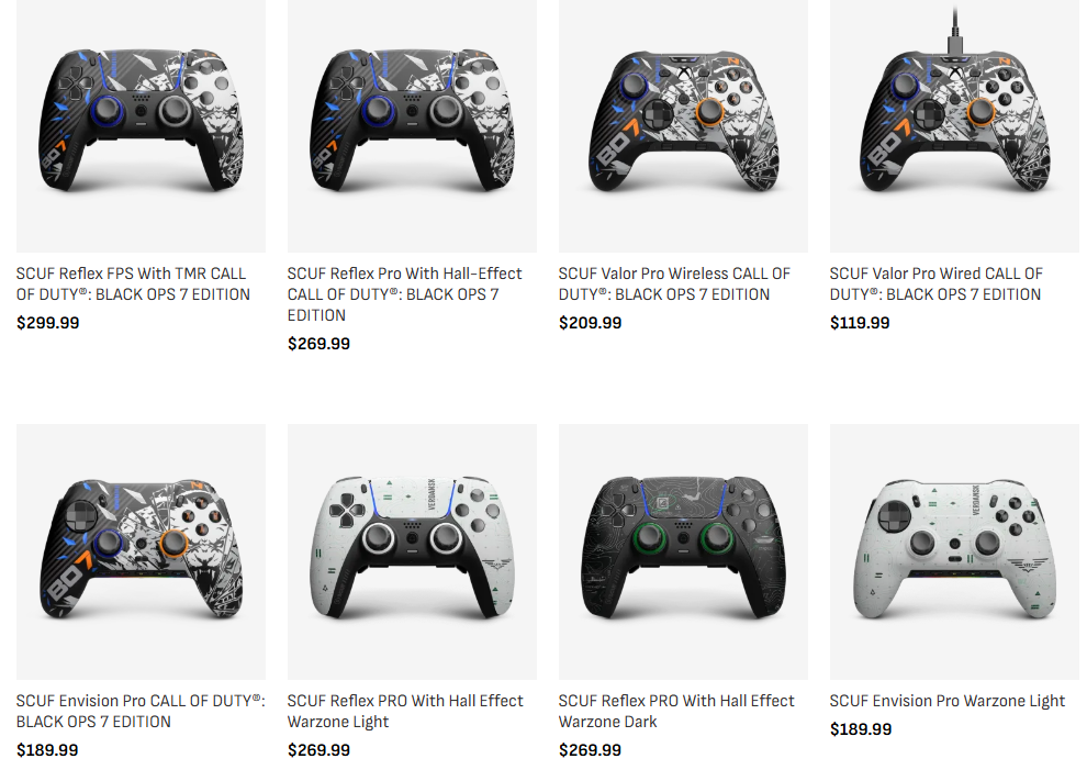 Nyilván ha nem akarsz sokat költeni, akkor az egérpadot kell választani, mert az is nagyon menőn néz ki. A Corsair X CoD Black Ops 7 teljes választéka 13 terméket foglal magában, ezen belül öt Scuf kontroller-modell közül lehet választani. Választhatsz Valor Pro vezetékes vagy vezeték nélküli modellt is, vagy Reflex Pro vagy FPS modellt, sőt még Envision Pro-t is. Ezek mind hasonló kialakításúak, a jobb oldali markolaton világosszürke Call of Duty Cerberus, a bal oldali markolaton BO7 motívum, a kontroller többi részén pedig világosszürke, kék és narancssárga minták találhatók.