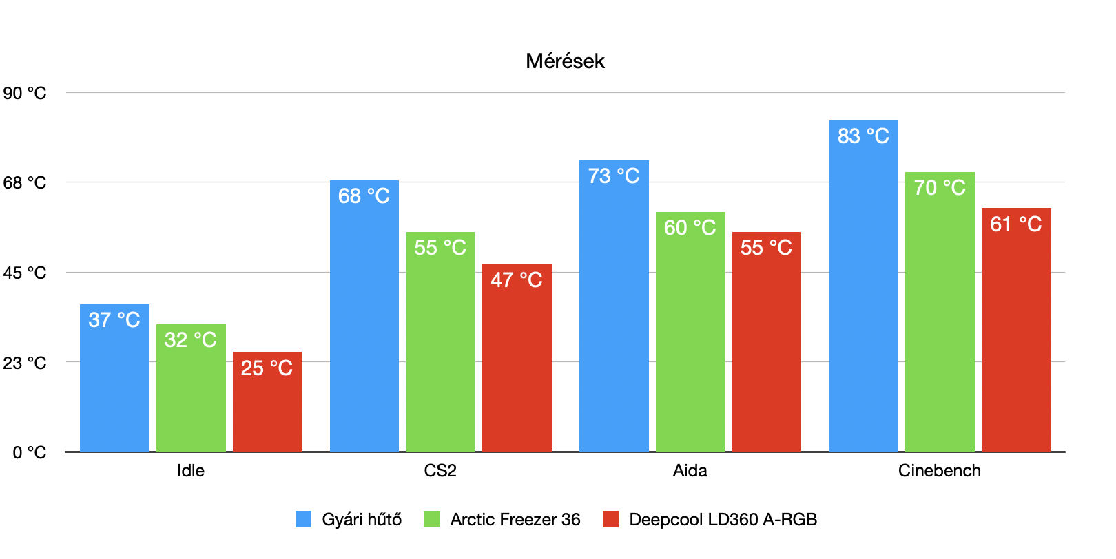 Jól látható, hogy már egy korrekt léghűtés is kellemes ugrással kecsegtet, ám egy 360-os AiO erejéhez nem sok léghűtő érhet fel. Ezzel a hűtővel a legdrágább Intel és AMD processzorokat is megzabolázhatjuk, legyen szó a Ryzen 7 9800X3D-ről vagy éppen az Intel Core i9-14900K CPU-ról.