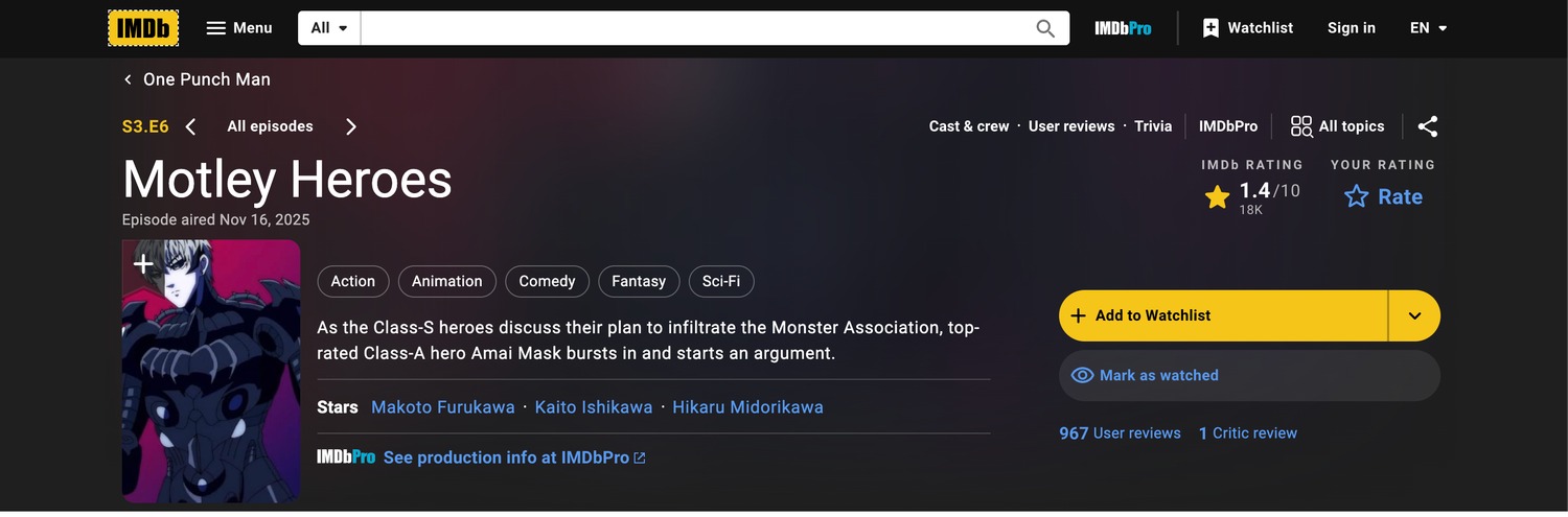 Nos, a helyzet az, hogy a One Punch Man anime-sorozat 3. évadának legutóbbi epizódja, ami a „Motley Heroes” címet kapta, alacsonyabb értékelést kapott az IMDb-n, mint a Dragonball Evolution valaha. Jelenleg több mint 1400 vélemény alapján 1,4/10-es értékelésen áll, míg az Evolution 84 000 vélemény alapján 2,5/10-es értékelést kapott. A Rotten Tomatoes oldalon sem állnak sokkal jobban a dolgok. Ott a 3. évad összességében 5 százalékos értékelést kapott, míg az Evolution 19 százalékosat!