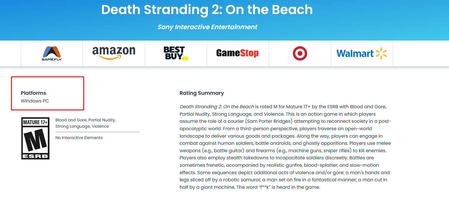 Ez abból lehet sejteni, hogy nemrég kiderült: a játék korhatár-besorolása már látható a hivatalos oldalon, ami kifejezetten a Windows PC-re vonatkozik. Bár nem meglepő, hogy a Death Stranding 2 PC-re is megjelenik, nem számítottunk ilyen gyors említésre a port kapcsán, tekintve, hogy az első játék csak 2 év után jelent meg a platformon. A DS2 idén nyáron jelent meg, szóval igen hamar megkaphatjuk a portot. Ez a besorolás persze nem jelenti feltétlenül azt, hogy be is jelentik a Windows verziót, de reménykedni azért lehet. Ezek alapján gyorsan haladnak a dolgok, bár az is lehet, hogy Kojima csapata előrelátó.