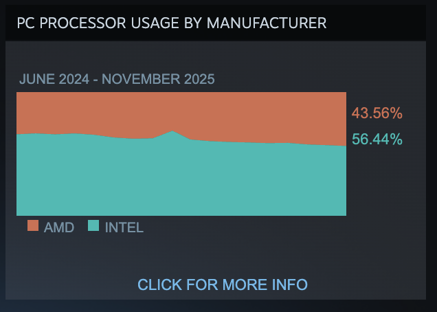 Ahogy feljebb már elárultuk, az nem kérdés, hogy jelenleg a 6 és 8 magos processzorok korát éljük. Hosszú idő után 2025 elején már látványos jele van annak, hogy az AMD egyre népszerűbb a játékosok körében. Ha jól megfigyeljük a fenti képet, akkor remekül leolvasható, hogy az AMD számai javultak az utóbbi hónapokban. Korábban 33-34%-os szeletet kért magának a vörös óriás, 2025 januárjára azonban ez már közel 38% lett és a februári korrekció sem állította vissza a korábbi, 33%-os értéket. Ez bizony erősen pozitív jel az AMD számára. Ha megvizsgáljuk a jelenlegi népszerűségi statisztikákat, akkor nagy eséllyel hónapokon belül átlépheti a 40%-ot is a cég, ahogy kihullanak a régebbi, Inteles konfigurációk. Itt is hasonló változást olvashatunk le, mint az operációs rendszer esetében. Látszólag az Intel visszatámadott, ám ez is csak egy pillanatnyi zavar a statisztikában, az április elején publikált mérések pontosabb képet adnak majd. A statisztika itt is megjavult, az AMD ismét 38%-on állt, májusra pedig már a közel 40% sem volt álom. Június első napjaira pedig meg is ugrotta a 40%-ot az AMD, július első napjaira pedig már a 41% felé száguldott, melyet augusztusra magabiztosan túl is szárnyalt. Ez a tendencia maradt szeptemberre is, október első napjaira pedig már a mágikus 42%-ot sikerült átlépni, melyet novemberben is stabilan megőrzött a vörös óriás. December első napjaiban 43.5%-ot olvashatunk le, egy pillanatig sem lélegezhetnek fel az Intel tulajdonosok.