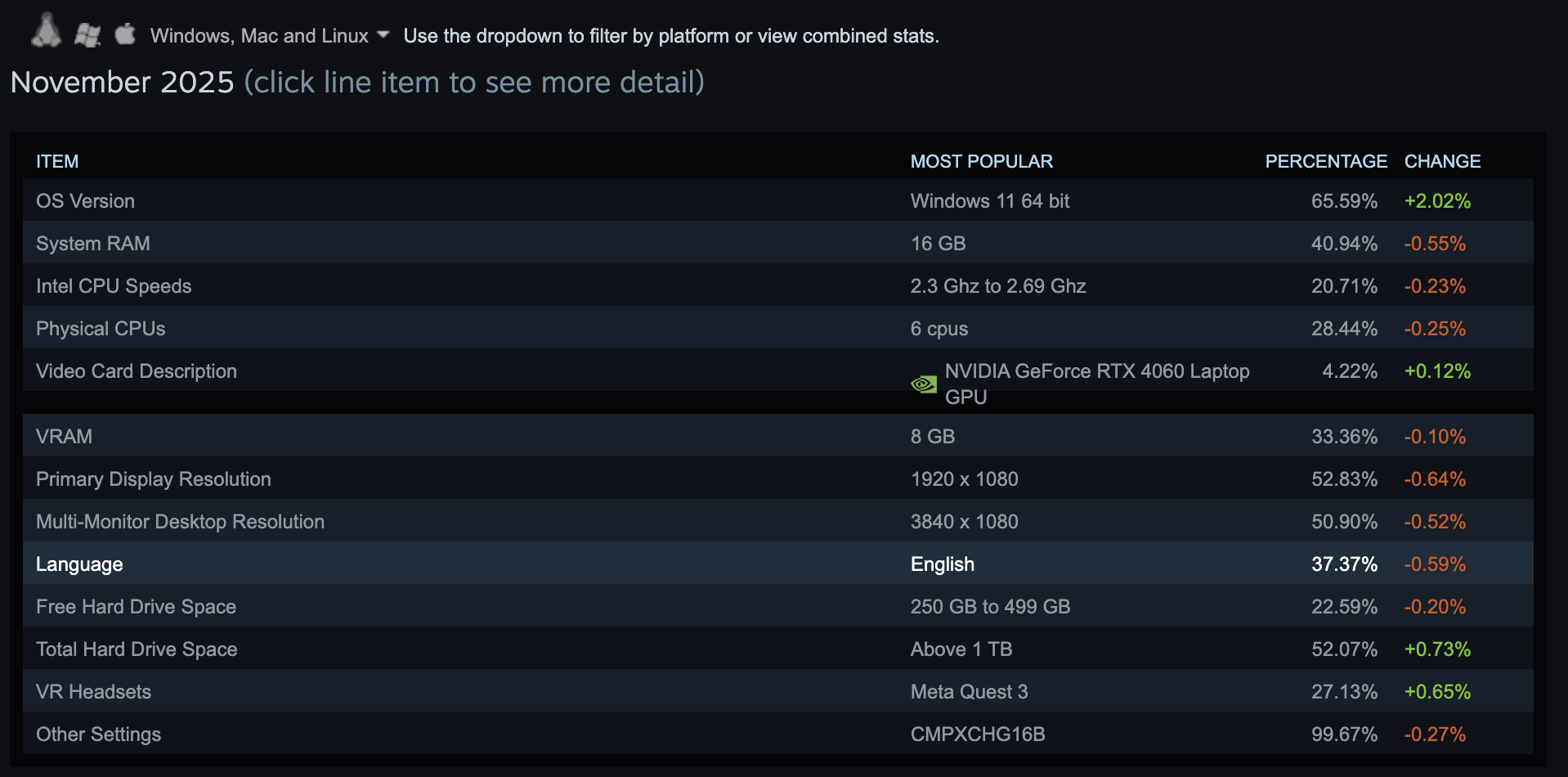 Természetesen az összképet is érdemes vizsgálni, nem csak az egyes komponenseket. A Steam statisztikája igazán részletes, hiszen a fő komponensek mellett vizsgálja a számítógépekben található memóriákat, a háttértárakat, de ezen kívül a monitorok felbontását és számát is aktívan elemzi. A rendszer nyelve sem maradhat titokban a Valve programja előtt, ahogy bizony a VR szemüveg típusát is alaposan megjegyzi a Steam. Ezek alapján az alábbi következtetéseket vonhatjuk le: