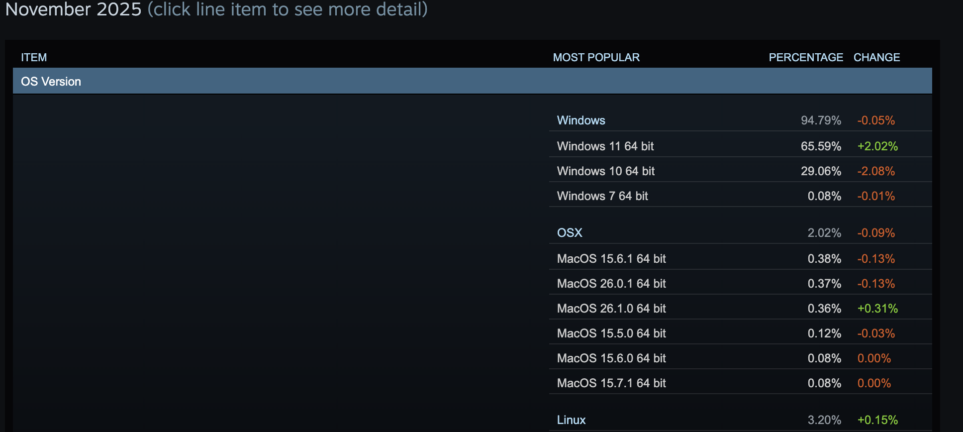 A 2025-ös évet erősen nyitotta a Windows 11. Míg korábban elég közel táncolt egymással a Windows 11 és 10, januárra már brutális különbség alakult ki a két rendszer között, mely februárban is csak minimálisan csillapodott. A Windows 11 közel 54%-os szeletet kér magának a játékosok körében, a Windows 10 pedig szépen lassan 43% alá ért. Biztosak lehetünk abban, hogy ez a tendencia tovább folytatódik majd az év további hónapjában is, hiszen a Windows 10 támogatása ősszel hivatalosan is véget érhet. Addig pedig sokan kénytelenek lesznek fejleszteni a masinákon, hogy a TPM, SecureBoot vagy éppen DirectX 12 követelményeknek is megfeleljenek. 2025 márciusának első napjaiban azonban úgy tűnhet, hogy a Windows 10 brutálisan visszatámadott, hiszen megfordultak az arányok. Ezt azonban annak köszönhetjük, hogy az átlagnál jóval több kínai gép is részt vett a Steam méréseiben, ahol bizony még mindig a Windows 10 lehet az úr. Áprilisra visszaállt a rend, szépen látható a Windows 11 előnye, 55-40% már az állás. Ezt májusra tovább sikerült növelni, közel 58%-on áll már a Windows 11. 2025 júniusára is kitartott a lendület, így sikerült átlépni az 58%-os határt, akkor úgy tippeltünk, hogy július vagy augusztusban a 60% is meglehet. Nos, csak egy-két hónapot tévedtünk, hiszen szeptember első napjaira már 60% felett virított a Windows 11. Októberre és novemberre pedig már a 63%-ot is sikerült átlépni, folyamatosan menekülnek a játékosok Windows 10-ről. Decemberre sem változott a trend, ám immáron a 65%-os álomhatárt is megugrotta a 11-es verzió.