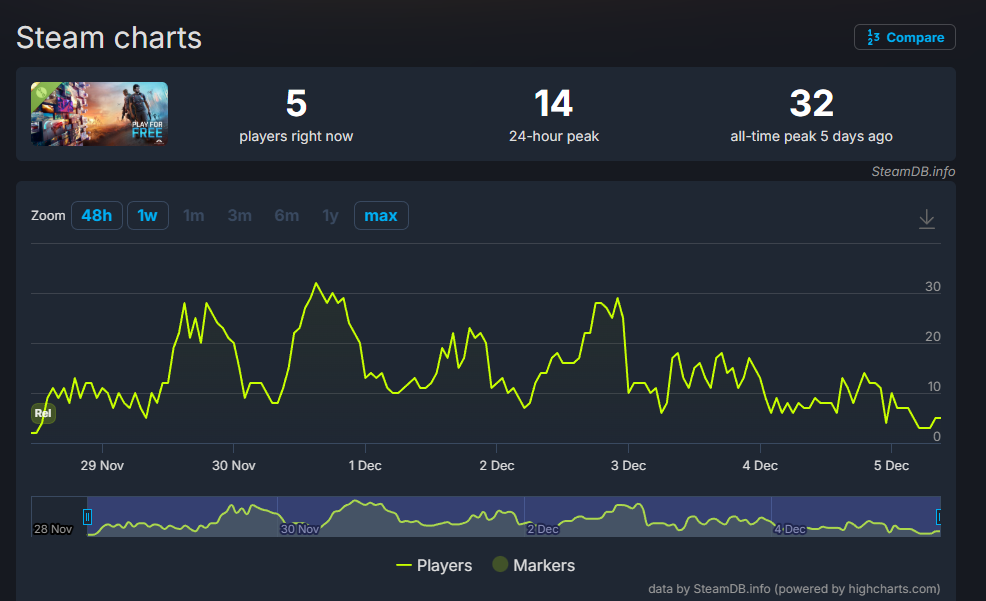 Bár igaz, hogy ez csak a Steam játékosokat jelenti, a SteamDB adatai nem túl fényesek. Hat nappal a Starter Pack megjelenése után a csúcs 32 játékos lett. Ezt még november 30-án érte el, a cikk írásában pillanatában 5-en játszanak vele.