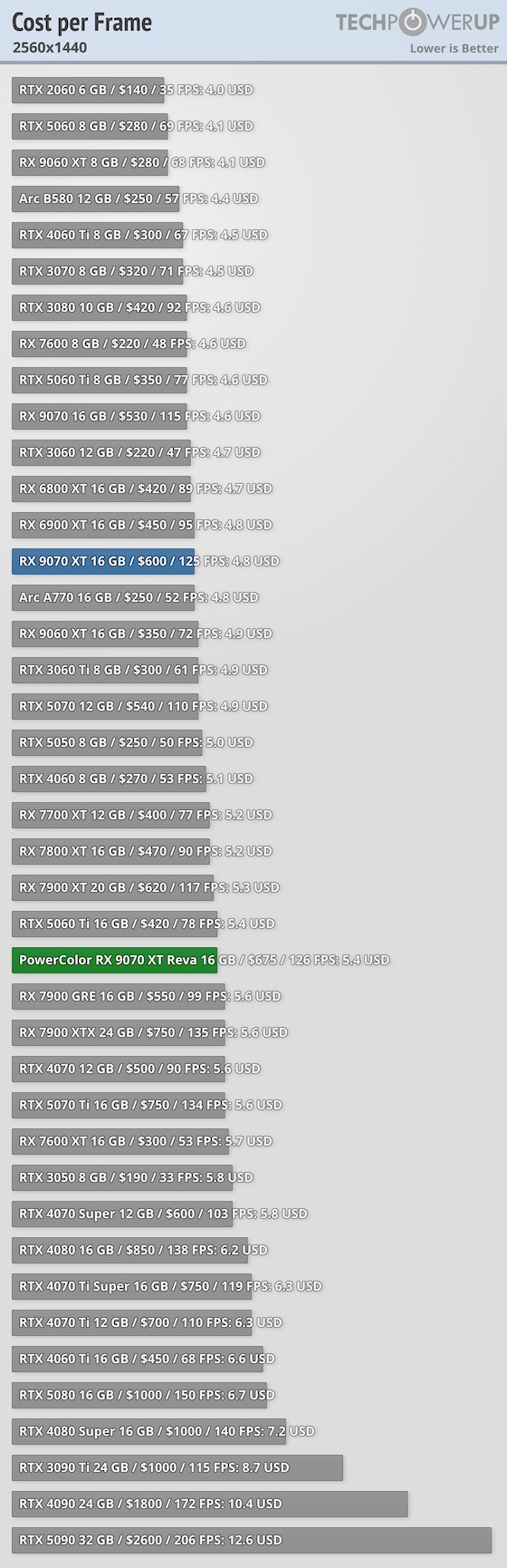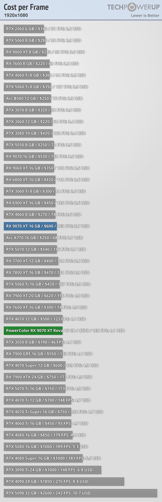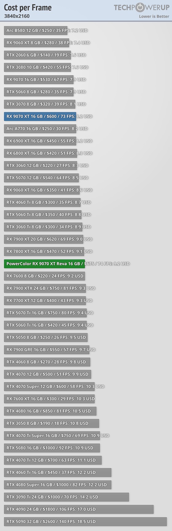 Érdekességképp érdemes lehet megtekintenünk azt a táblázatot is, mely a dolláronkénti FPS értéket mutatja meg számunkra. Gyakorlatilag ez az a mutató, mely arról dönt, hogy az adott videokártya mennyire rendelkezik kellemes ár-érték aránnyal. A lista tetején találjuk azokat a kártyákat, melyek a legtöbb FPS-t adják egyetlen dollárért cserébe, míg a lista alján a legkevésbé megérős választásokat. Nem titok, hogy a flagship kártyák teljesítenek a legrosszabbul ilyen téren, ám ott azt kell megfizetnünk, hogy az adott generációban gyakorlatilag nem kapunk erősebb modelleket. Most talán egy pár hónapos, nyugodt időszak következik, ám az AMD oldaláról ott kopogtat a RX 9070 GRE 16 GB-os változata, miközben bizony az Intel is adós maradt a B700-as videokártyákkal. Az Nvidia SUPER-ek érkezésére papíron nem kell várni, hiszen a brutális GDDR7 árak miatt az Nvidia elnapolta azokat. A driverek folyamatos frissülése miatt pedig mindig érdemes lehet ránézni az éppen aktuális erősorrendre is.