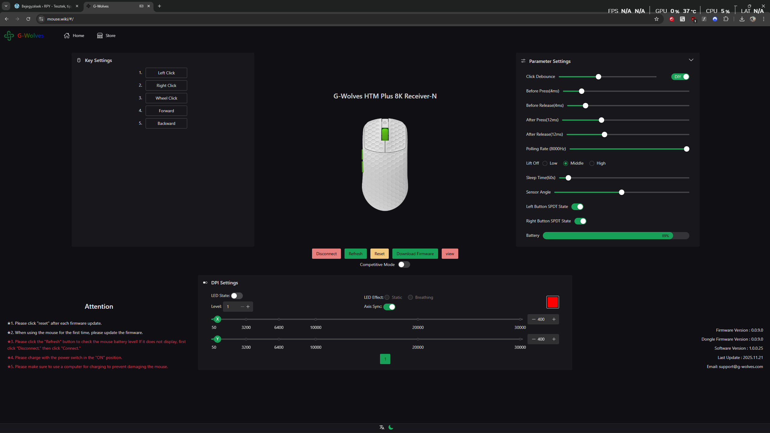 A dual 8K rendszer azt jelenti, hogy a HTM Plus vezetékes és vezeték nélküli módban is képes ~8000 Hz polling rate-re. Ez ma még mindig nem iparági alap, inkább csúcs-kategóriás extra, itt viszont stabilan hozza, amit kell. A késleltetés a top mezőnyben van, az input érzet nagyon feszes, az egér „azonnal” reagál a mozdulatokra.