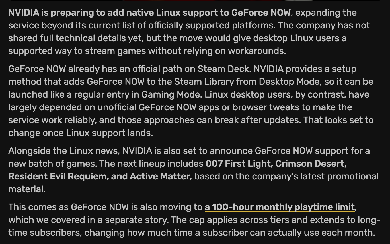 Az Nvidia az elmúlt órákban több szinten is üdvözölendő bejelentést tett. A cég elárulta, hogy érkezik a natív Linux támogatás, melynek köszönhetően még több platformról elérhető majd a cég szolgáltatása. Steam Deck rendszeren már elérhető volt a szolgáltatás, ám az asztali linux rendszerek felhasználói harmadik féltől származó alkalmazásokra vagy a weboldalra voltak rászorulva. Ennek azonban hamarosan vége, heteken belül megérkezhet a teljesen hivatalos applikáció.