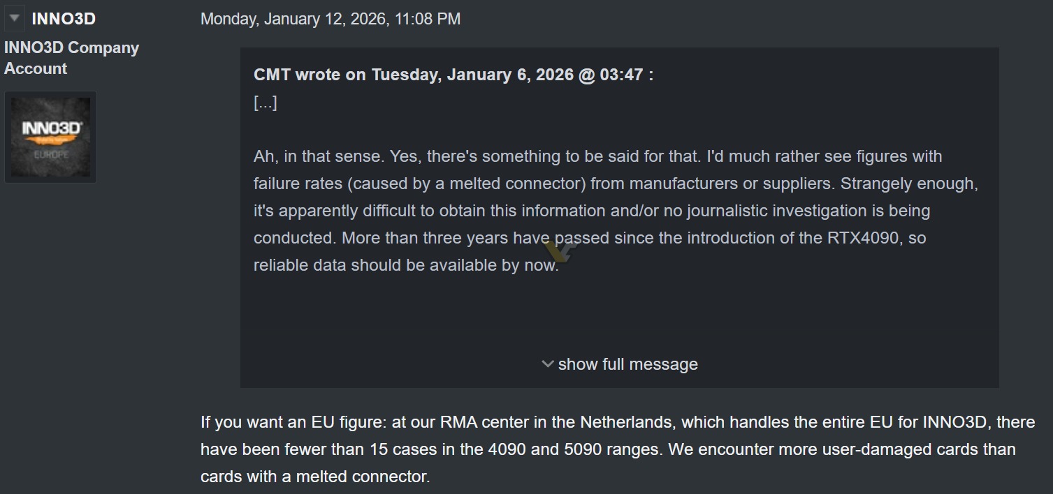 Az INNO3D munkatársai meglehetősen aktívak a cég saját fórumain, gyakran válaszolnak az éppen felmerült kérdésekre. Az elmúlt hetekben az egyik felhasználó felvetette, hogy kíváncsi lenne pontos adatokra azzal kapcsolatban, hogy mennyi kártyát kellett javítani vagy cserélni a leégéseknek, olvadásoknak köszönhetően.