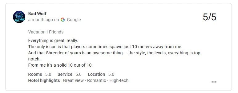 Az egészet egy bizonyos Bad Wolf nevű értékelő indította el nagyjából körülbelül egy hónapja, amikor azt írta, hogy bár a szállodában „minden remek”, „az egyetlen probléma, hogy a játékosok néha hirtelen 10 méterre tőlem megjelennek”. Az azóta eltelt hetekben az összes értékelés – kivéve egyet, amit egy valódi vendég írt – az Arc Raiders-re utalt, az egyszerű „Hé, Raider! Ne lőj!”-től kezdve egészen az olyan figyelmeztetésekig, hogy más vendégek legyenek óvatosak az ellenséges Arcokkal, ha a szellőzőaknákban haladnak át. Egy raider például „kedves” megjegyzést hagyott hátra, amiben leírta „eseménydús” Night Raid tartózkodását, amikor egy Venator-t forgató „szállodaigazgató” mentette meg, miután erőszakos összetűzésbe keveredett egy másik vendéggel a szálloda metróbejáratánál.