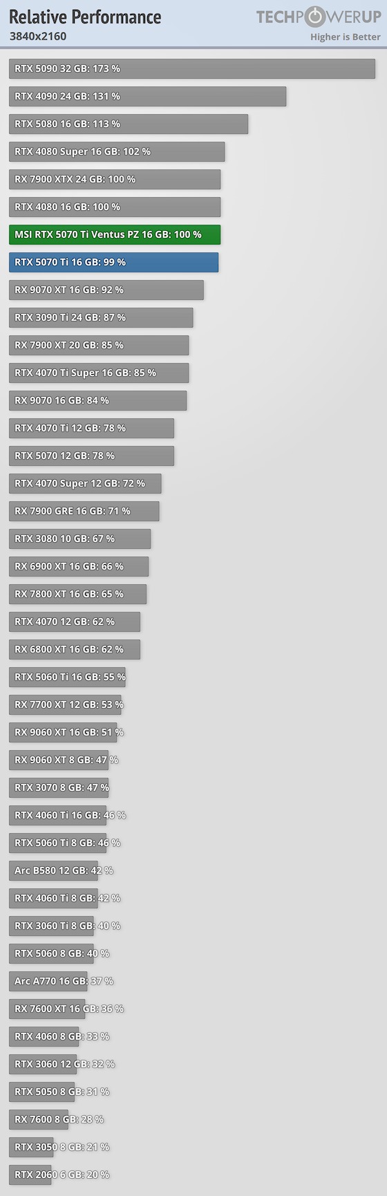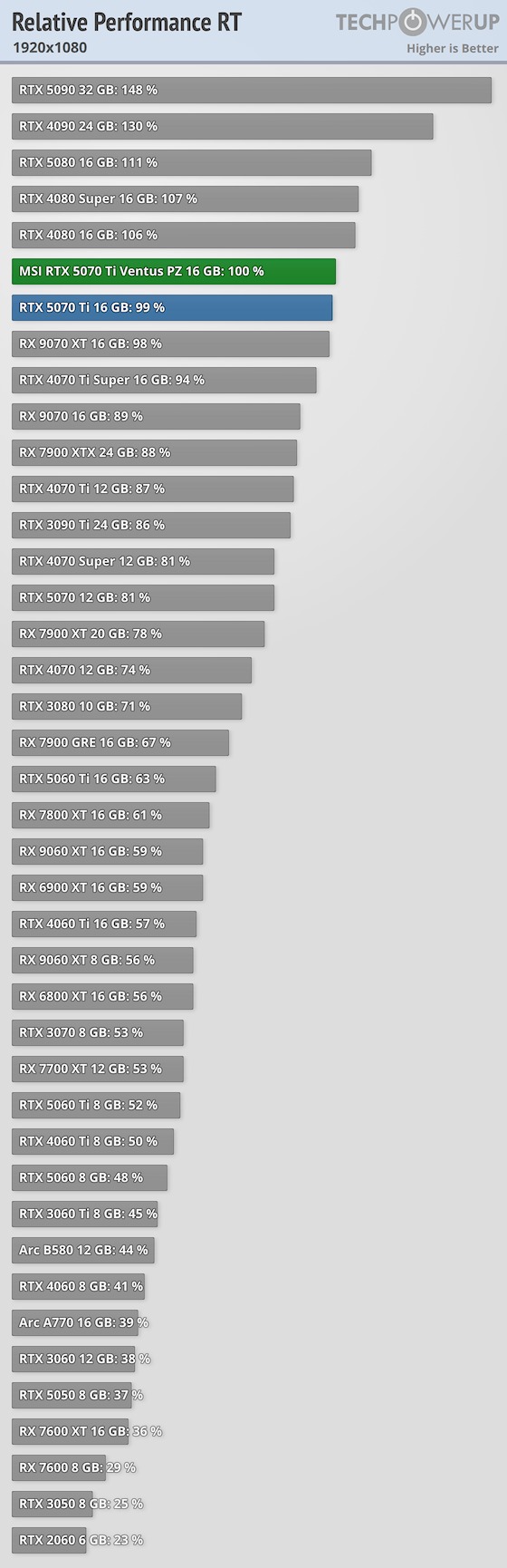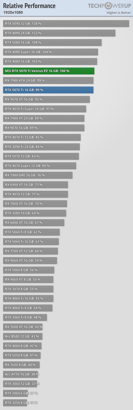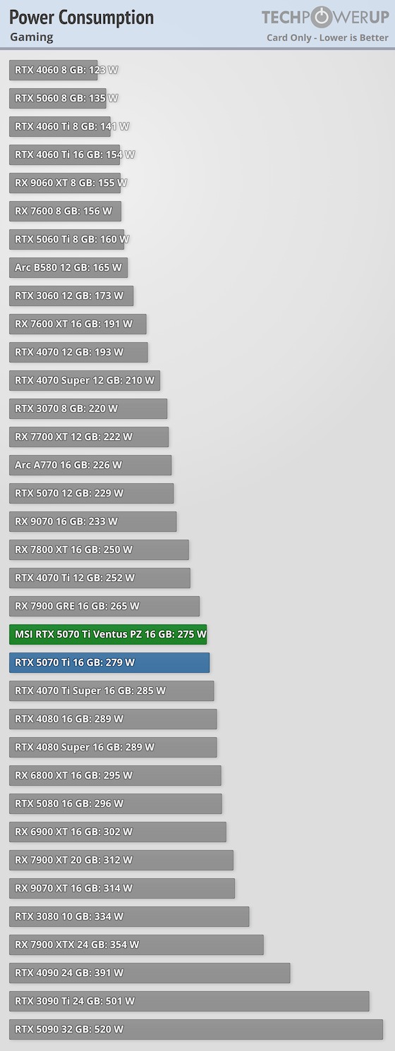 A fenti táblázatok a 2026. február 5-én legfrissebbnek számító, MSI GeForce RTX 5070 Ti Ventus 3X PZ TechPowerUP tesztből származnak.