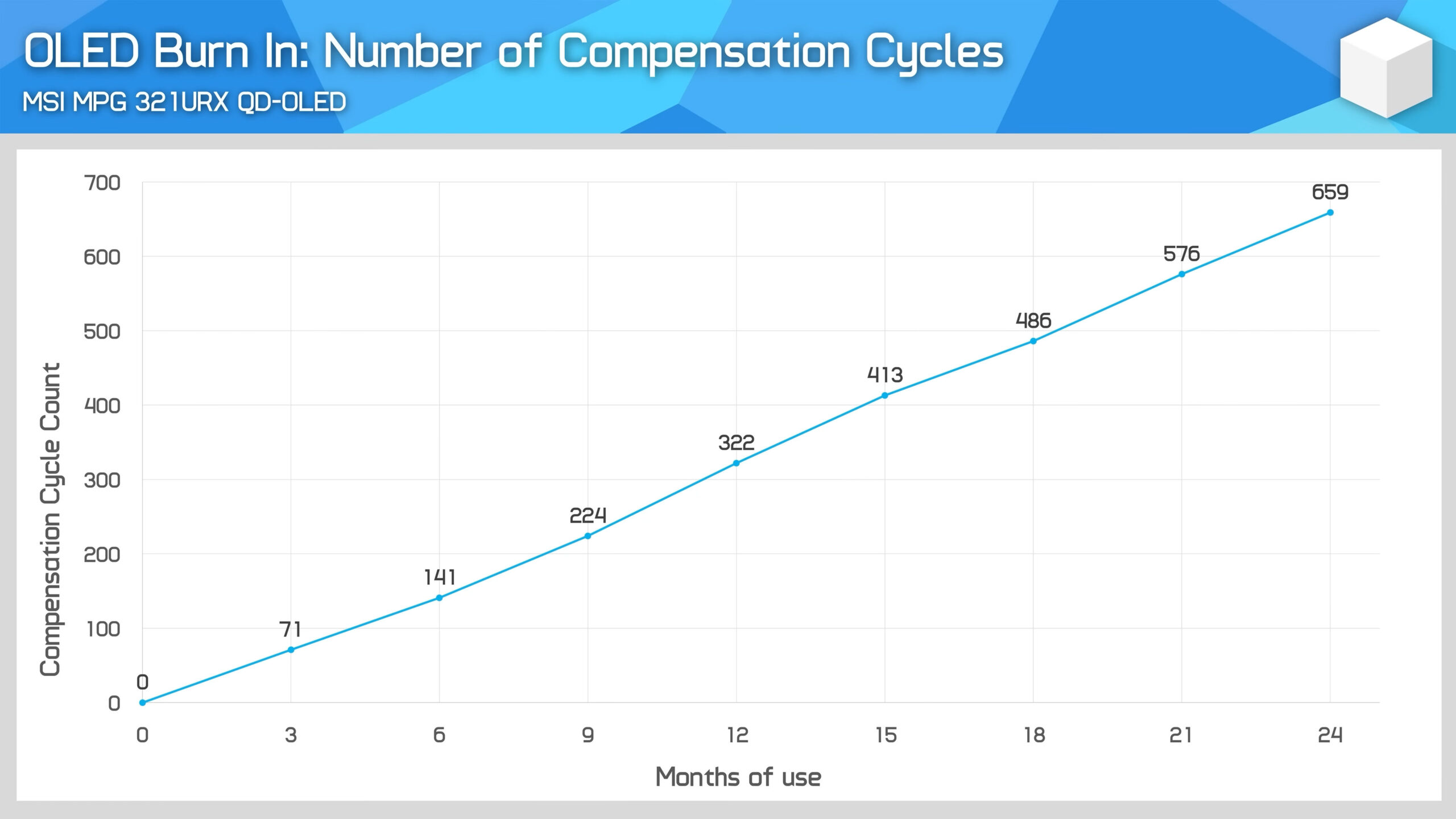 A 18. hónap után a 21. és 24. hónap sem változtatta meg az oldal munkatársainak véleményét, azaz hogy a zöld alpixelek gyorsabb ütemben éghetnek be, mint a piros és kék alpixelek. A cián és a sárga háttér is igénybe veszi a zöld alpixeleket, ahol számukra láthatóbb is volt a beégés, míg például a magenta előállításához csak a piros és kék pixelekre van szükség, ezért kevésbé látványos a panel degradálódása.