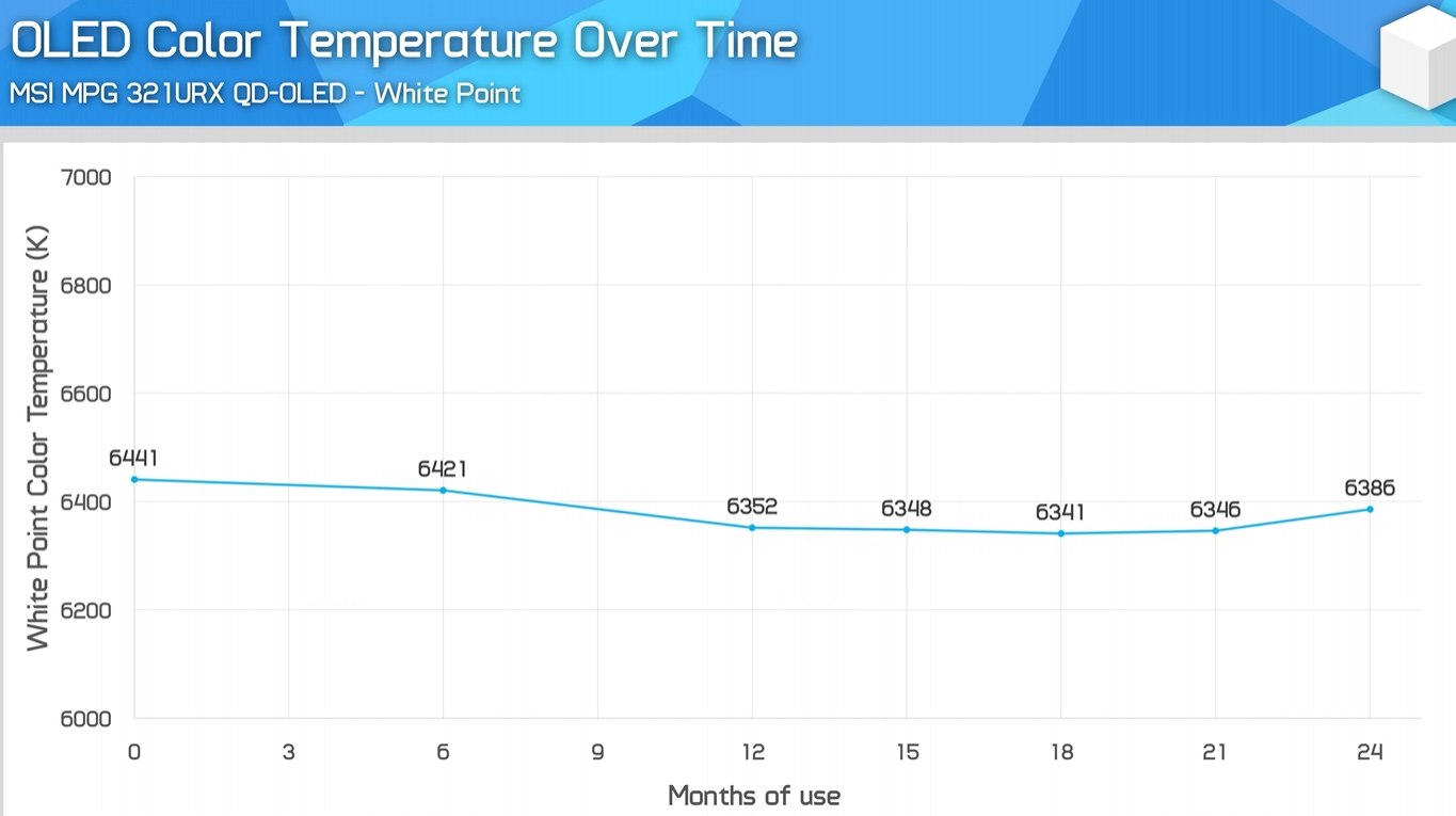 A sima, mesterségesen nem felerősített képeken is alig kivehető beégés jelen pillanatban semmilyen hatással nincs a használhatóságra és valós körülmények között nem is láthatóak. A 24. hónapban ismét kaptunk egy extra mérést is, mely a fehér színek hőmérsékletét hivatott bemutatni, ez látható a fenti képen. Leolvasható, hogy az első 12 hónapban az érték észrevehetően csökkent, ám azóta gyakorlatilag állandó számot vett fel, azaz valószínűleg a degradáció az első 1 évben volt a legerősebb. Sőt, a 24. hónapra javult is egy kicsit ez az érték, mely még az oldal munkatársait is meglepte.