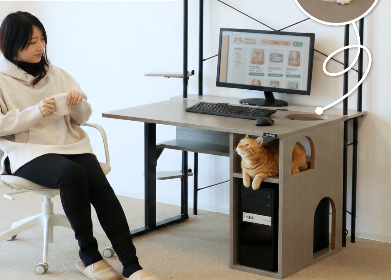 Bár az asztal úgy néz ki, mint egy hagyományos íróasztal, van benne egy kétszintes macskafülke, ami saját teret biztosít a cicának. A hátsó részén egy rejtett alagút is található, amit azoknak a macskáknak terveztek, akik szeretik a szűk, sötét helyeket, így kapnak egy olyan helyet, ahol elbújhatnak anélkül, hogy a gazdájuk lábai alá kerülnének.