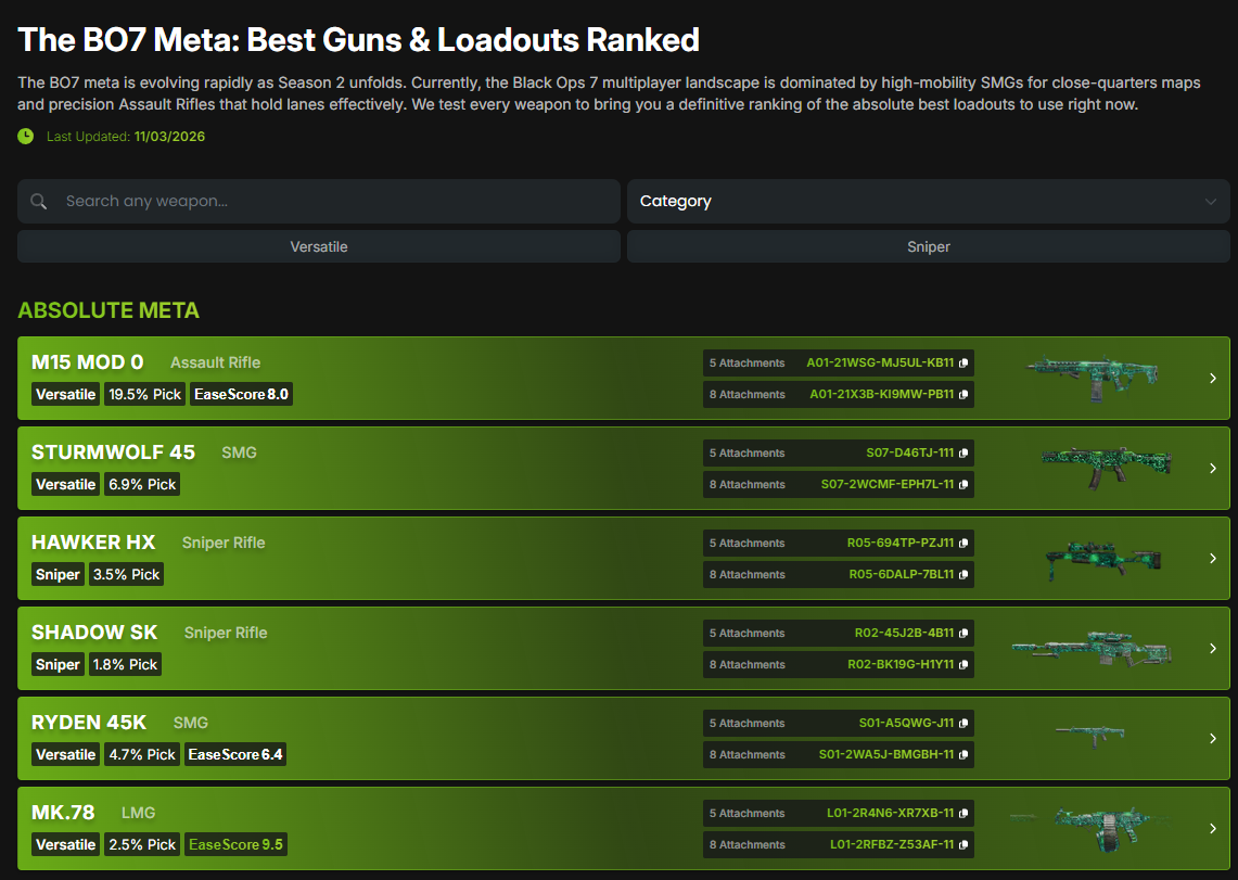 Remekül látható, hogy ez a lista teljesen máshogy alakul, mint a Warzone felhozatal. Nem véletlen, hiszen hiába ugyanazok a fegyverek, a nyers tulajdonságok és a körülmények bizony eltérnek. A hetedik hétre a Voyak KT-3 már a második helyig menetelt, múlt héten még csak a bronzérmet vihette haza. Úgy tűnik azonban, hogy az M15 Mod 0 elmozdíthatatlan továbbra is az első helyről.