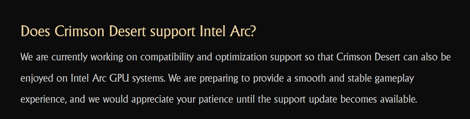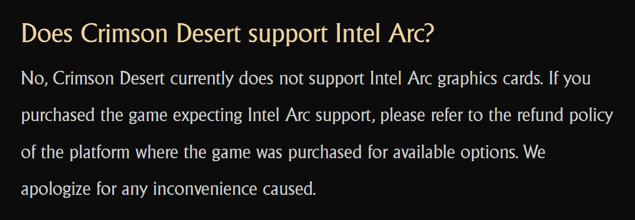 A játék gyakori kérdések aloldalán az alábbi üzenettel találkozhattak az Intel Arc tulajdonosok az első napokban, ha az Intel ARC támogatással kapcsolatban keresgéltek: