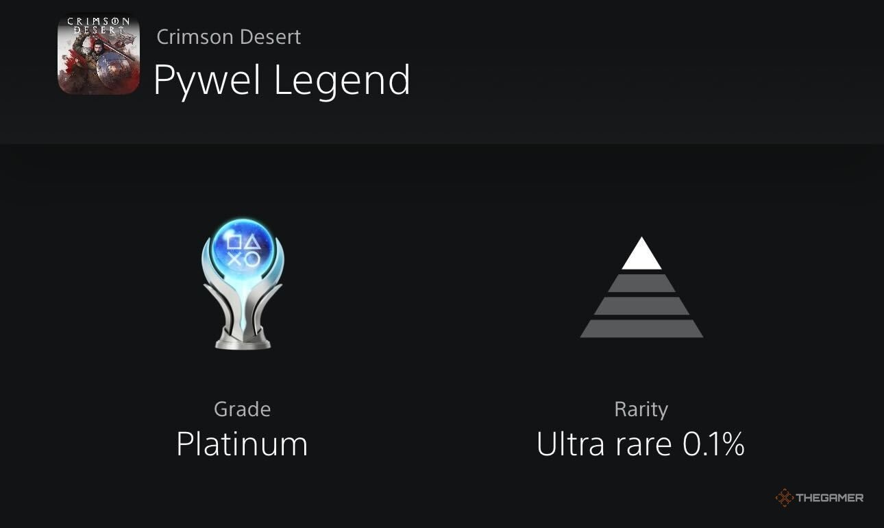 A PowerPyx egy megbízható, régóta működő PlayStation trófea-oldal. Az oldal szerint a Crimson Desert platina-trófeájának megszerzéséhez több mint 300 óra szükséges a „hosszú történet, a sok időigényes kihívás, a hatalmas pálya és a rengeteg mellékküldetés miatt. Bár ezek közül nem mindegyik nagyon nehéz, a teljesítésük rengeteg időt igényel, beleértve a teljes térkép felfedezését, az összes fegyvertípus összegyűjtését és az összes minijáték megnyerését.