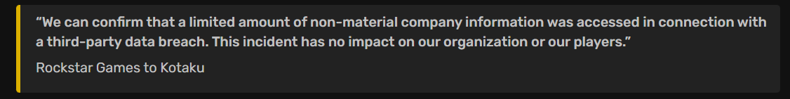 A Rockstar Games kiadott egy rövid nyilatkozatot, amelyben elismerte az incidenst, de azonnal hozzátette: semmi komolyabb nem történt. A stúdió szerint „korlátozott mennyiségű, nem anyagi jellegű céges információ” jutott illetéktelen kezekbe, és az egésznek „nincs hatása sem a szervezetre, sem a játékosokra.” Magyarul nem vitték el sem a GTA 6 forráskódját, sem a játékosok fiókját tartalmazó adatokat. Amit a ShinyHunters valószínűleg megszerezhetett: