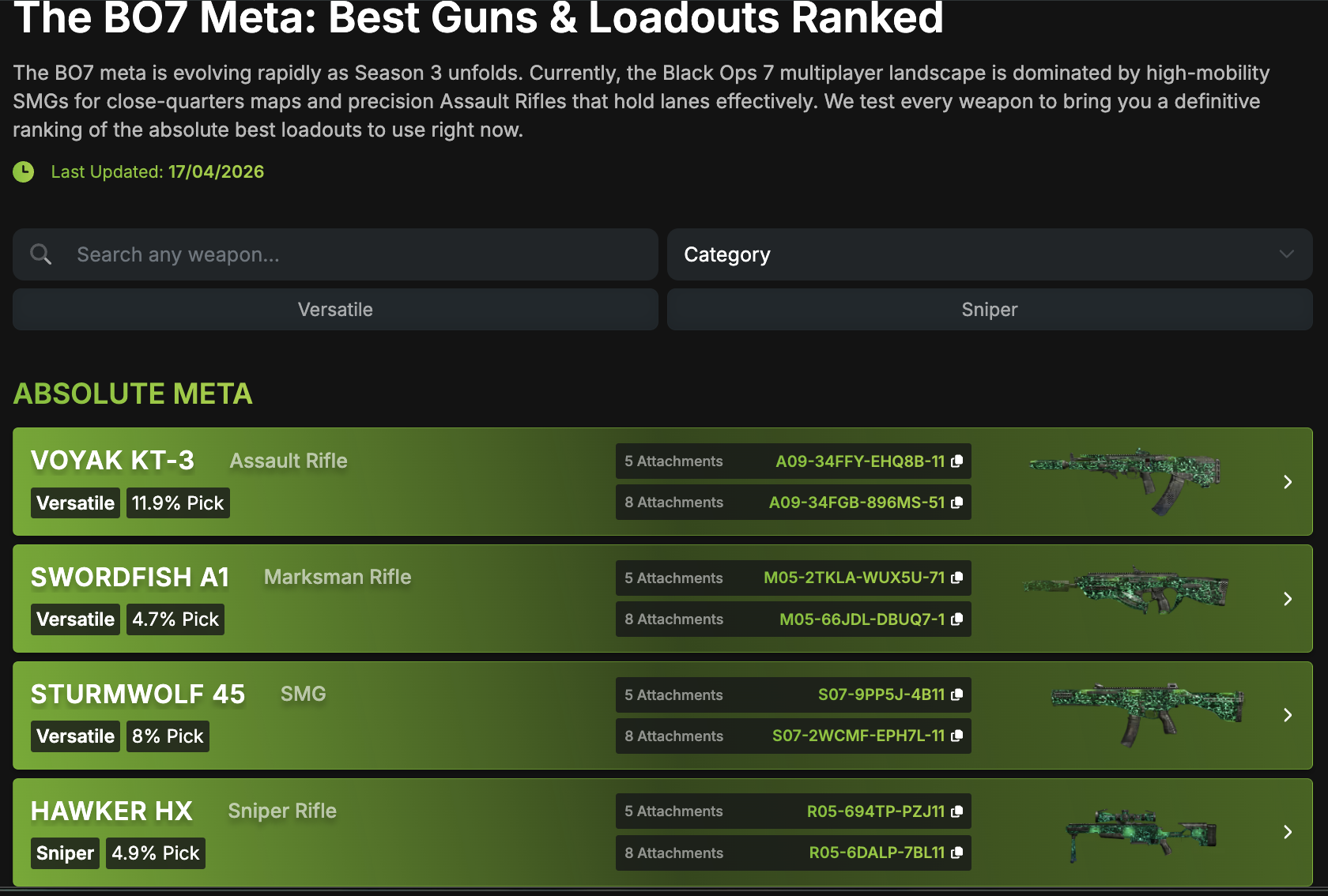 Warzone statisztikákhoz hasonlóan ezúttal is a CODMunity weboldala siet a segítségünkre. A legkritikusabb pont itt is a pick rate % lehet, azaz annak aránya, hogy hány játékos választja éppen az adott fegyvert. A BO 7-ben nem találkozhatunk a régi fegyverekkel, így szerencsére csak az új felhozatallal kell foglalkozni. Nézzük is, hogy mely fegyverek voltak a legnépszerűbbek a szezon harmadik hetében: