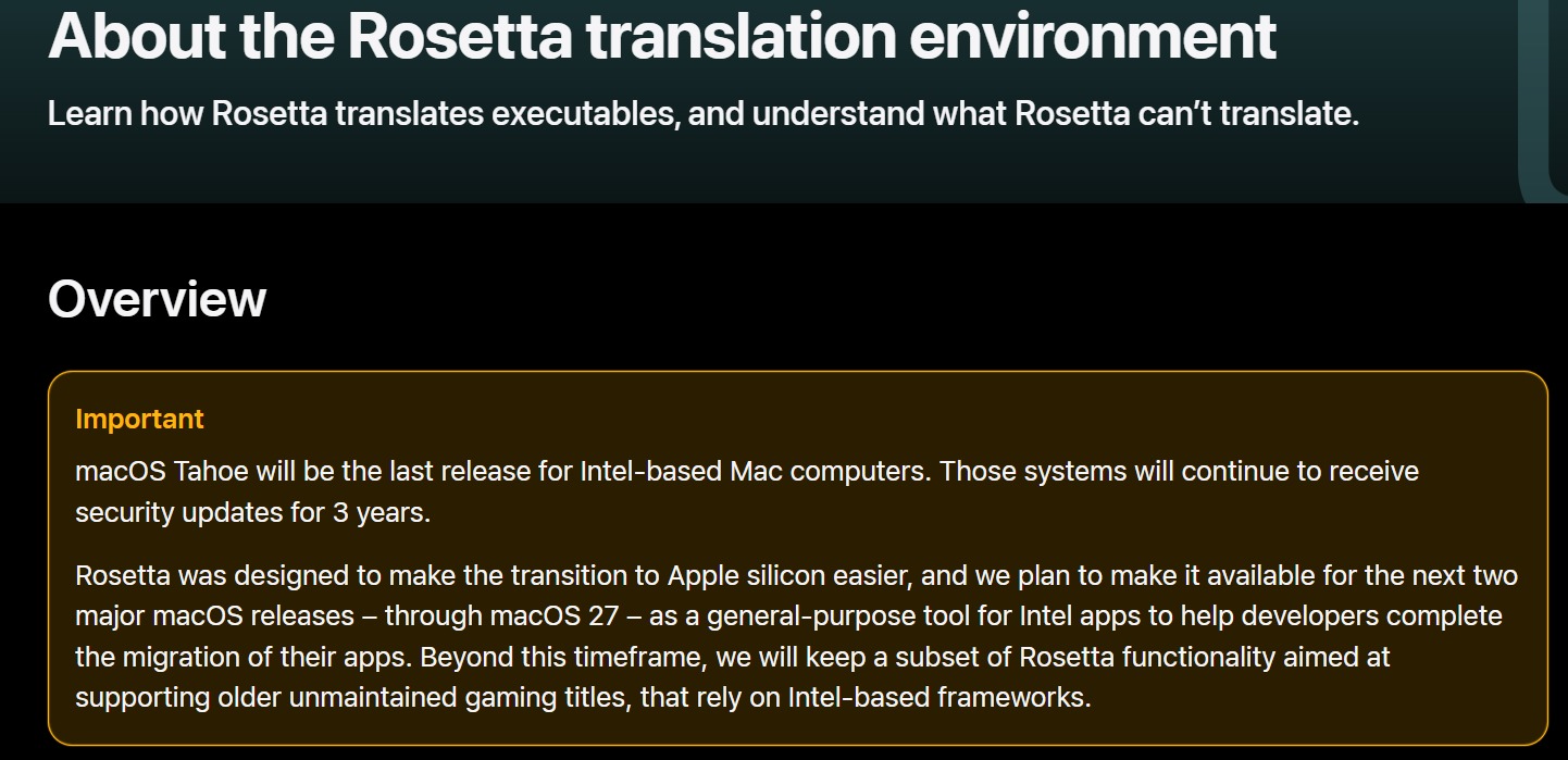 A Rosetta azért készült, hogy megkönnyítse az Apple Siliconra való átállást, és a következő két nagy macOS-verzióban – egészen a macOS 27-ig – továbbra is elérhető marad általános célú eszközként az Intel-alkalmazásokhoz, segítve a fejlesztőket az alkalmazásaik migrációjának befejezésében. Ezt követően a Rosetta funkcióinak egy részét megtartjuk, elsősorban a régebbi, már nem karbantartott játékok támogatására, amelyek Intel-alapú keretrendszerekre támaszkodnak.