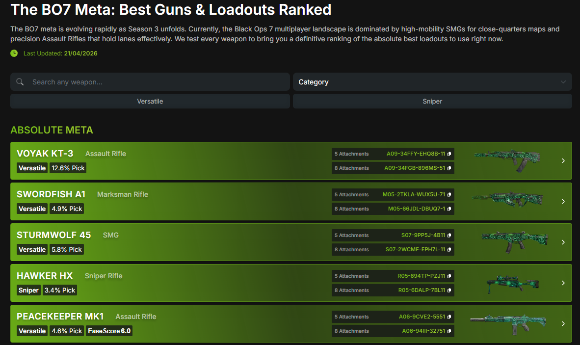 Remekül látható, hogy ez a lista teljesen máshogy alakul, mint a Warzone felhozatal. Nem véletlen, hiszen hiába ugyanazok a fegyverek, a nyers tulajdonságok és a körülmények bizony eltérnek. Jól látható, hogy a Season 3 elejének legnagyobb nyertese a Voyak KT-3 volt, de az újonc MK35 ISR is erősen kezdett. A harmadik hétre stabilizálódtak az erőviszonyok, több korábbi kedvenc is visszatért a legjobb 5-10 fegyver közé.
